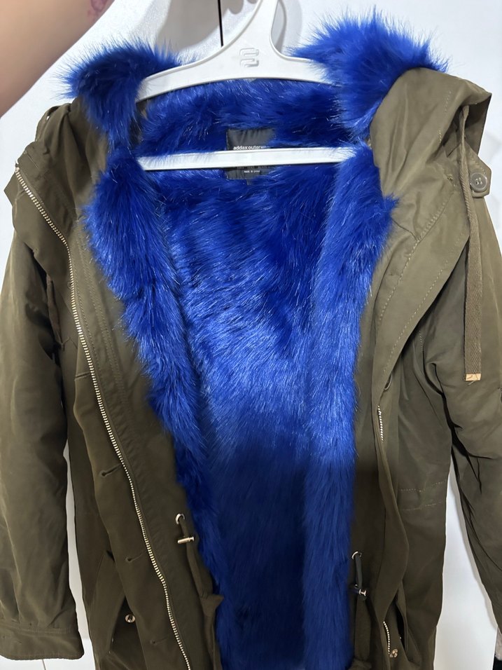 Fitted kesim, mavi kürklü detaylı, notched lapel yaka, normal midi boyda, askılı kollu, yumuşak fleece kumaştan kadın ceket. Outdoor kullanıma uygun. Uzun ve addax outlet ürün