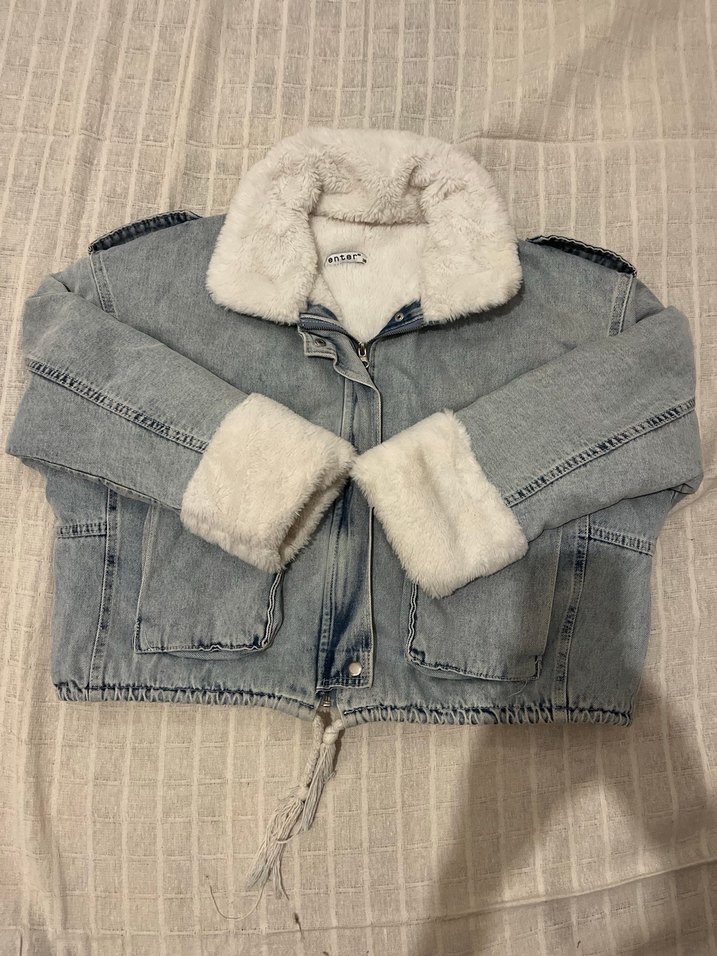 Bu mavi denim ceket, yakasında ve manşetlerinde yumuşak kürk detaylara sahip. Salaş kesimi ve uzun kollu tasarımıyla sokak stilini rahatlıkla birleştirir. Günlük kullanım için uygundur.