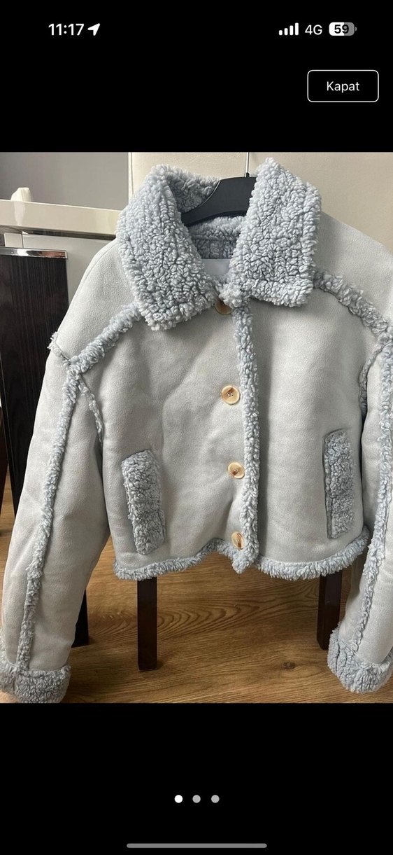 Mavi renkte, kısa kesim, ince oturan kadın mont. Kumaşı yumuşak ve kürklü detaylar yakada, manşetlerde ve ceplerde bulunur. Sokak stiline uygun.