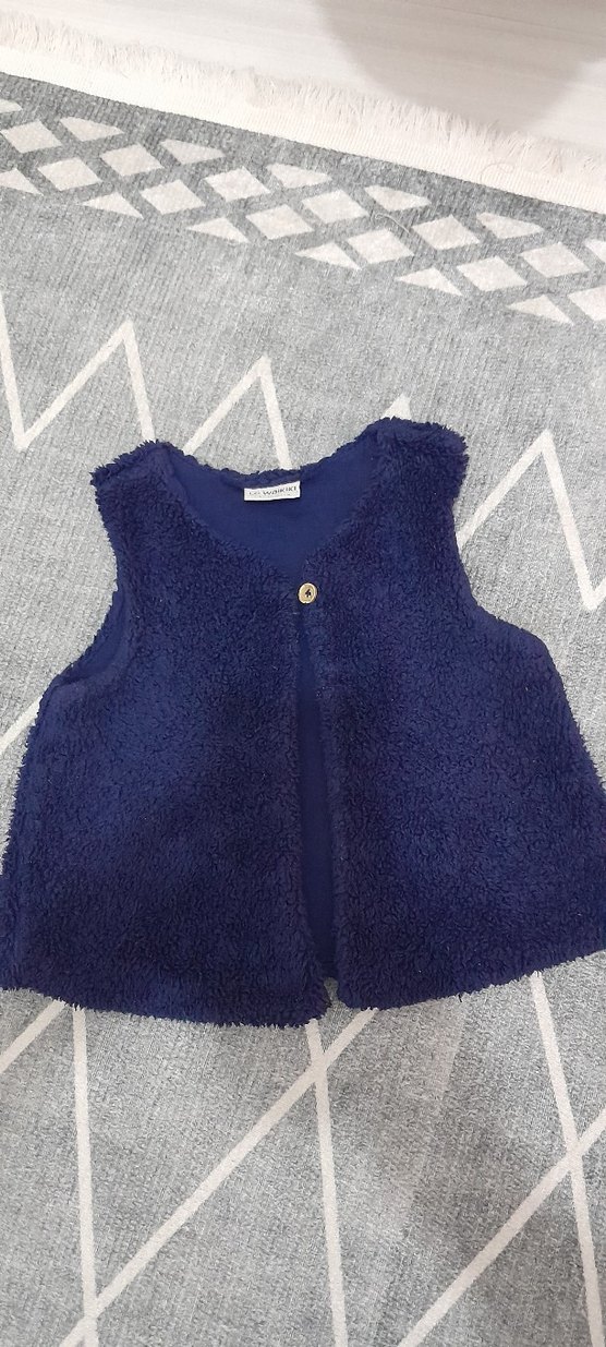 Mavi renkli, kolsuz ve yuvarlak yaka kız çocuk yeleği, yumuşak ve sıcak kürk detaylı kumaştan üretilmiştir. az kullanildi sorunsuzdur