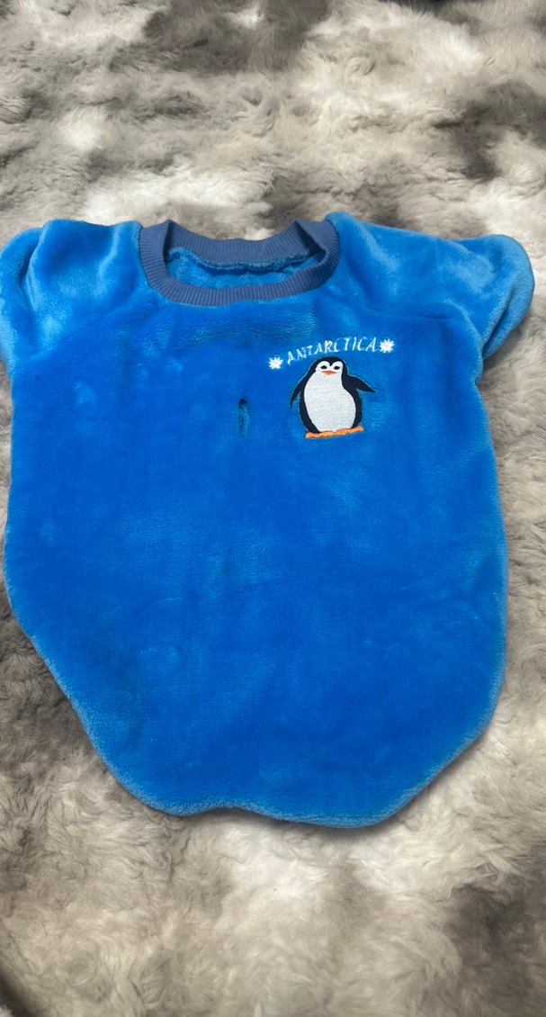 Renkli mavi köpek kıyafeti, yumuşak kürk detaylı ve desen içermeyen sokak stili tasarıma sahiptir.