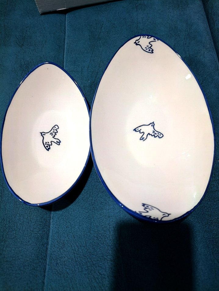 Mavi kenarlı ve kuş desenli iki parça küçük 20cm büyük 25 cm gondol servis tabaklarıCanlı mavi detayları vardır.