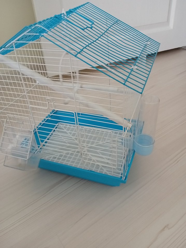Beyaz tel çerçeveli, mavi tabanlı kuş kafesi, su kabı,iki tane yemlik ve yemleri ile birlikte. Küçük evcil kuşlar için uygundur. Temizlemesi kolaydır.