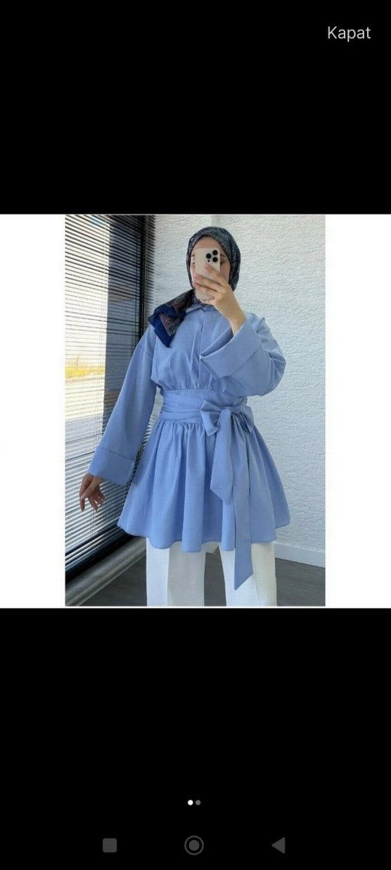 Açık mavi renkli, yüksek yakalı ve uzun kollu tunik. Kuşaklı bel detayı, bol kesim ve kısa boyuyla rahat bir görünüm sunar. Hafif batik desenlidir.