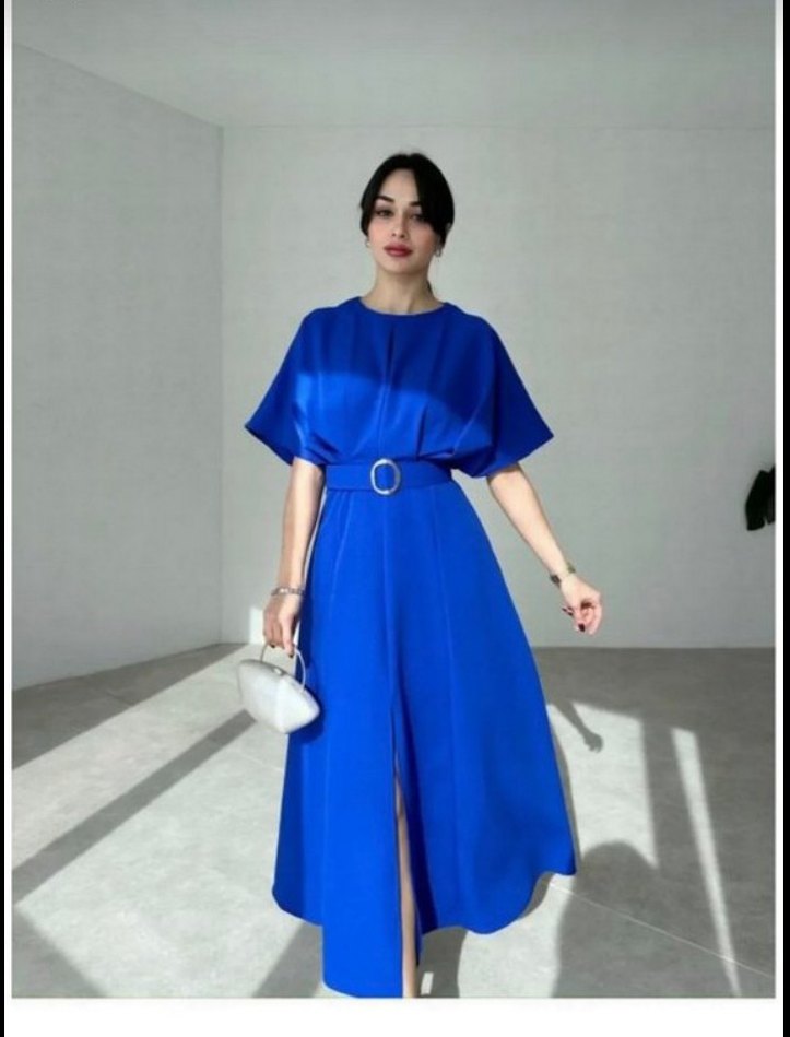 Mavi, kuşaklı ve kısa kollu uzun salaş elbise. İpeksi kumaştan, parlak görünümlü, modern ve minimalist tarzda. Günlük rahat kullanım için uygun. s, m, l, cl, XXL beden mevcut sıfır ürün arvenmoda ürünü