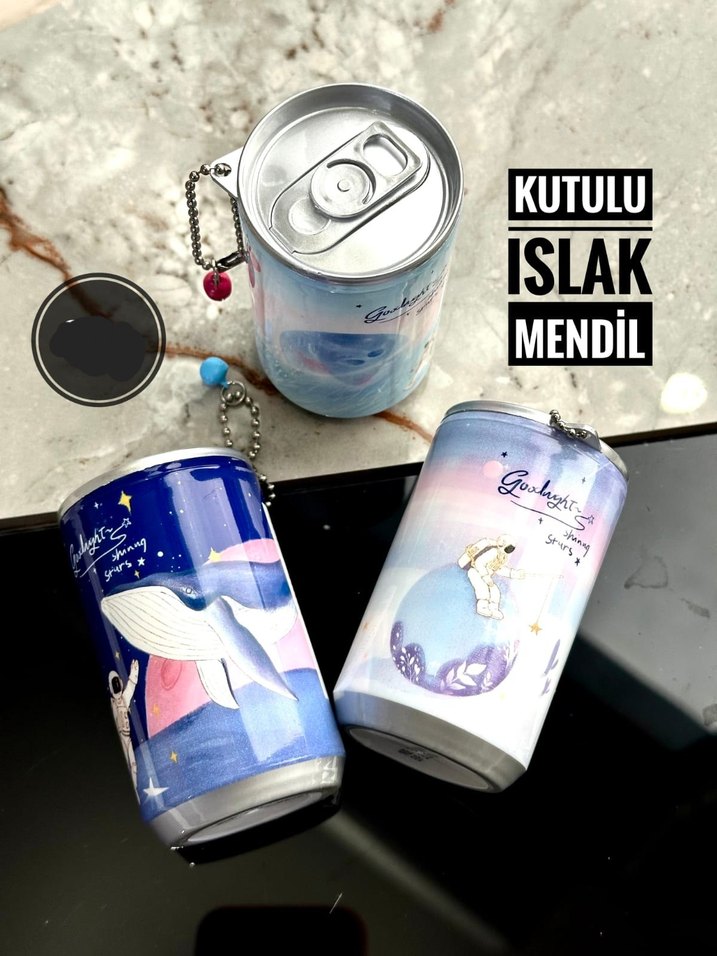 Renkli ve eğlenceli çizimlerle süslenmiş mavi kutulu ıslak mendil kutuları. Taşıma kolaylığı için anahtarlık ile birlikte gelir.