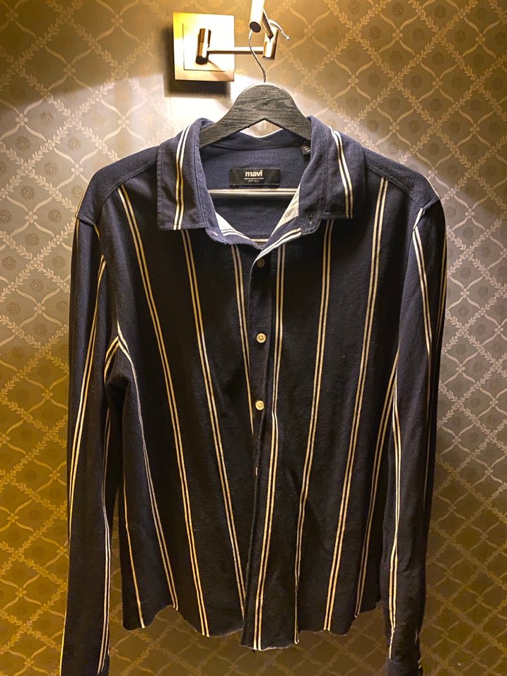 Düğmeli, lacivert beyaz çizgili erkek denim gömlek, uzun kollu ve çıtmalı yakaya sahip. Normal kesimle rahat bir sokak stili sunar.