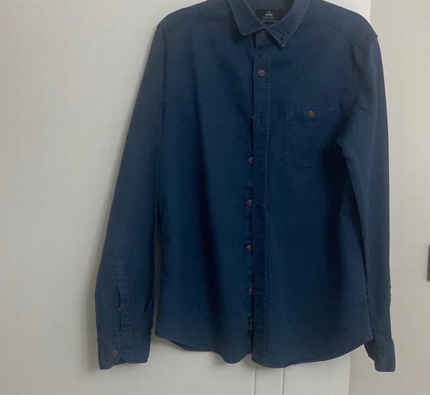 Lacivert renkte, düğmeli ve tek cep detaylı denim erkek gömleği. Normal boy, uzun kollu, rahat kesim sokak stili için uygundur.