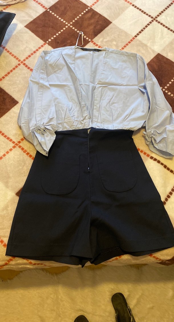 Mavi renkte, pamuklu kumaştan yapılmış, düğmeli ve uzun kollu, notched lapel yaka detaylı, bol kesim kısa kadın tulumu. Günlük kullanıma uygundur.