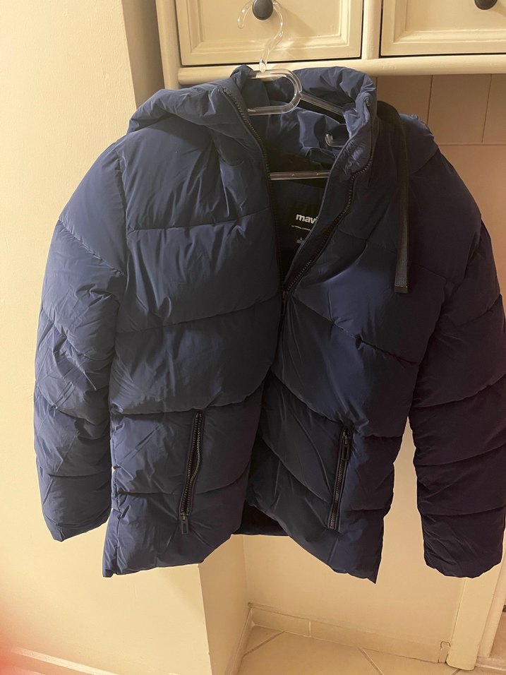 Lacivert, normal uzunlukta, kapüşonlu , yumuşak ve sıcak kumaştan yapılmış kadın kışlık mont Mavi mont bir kez kullanildi aralikta almistim