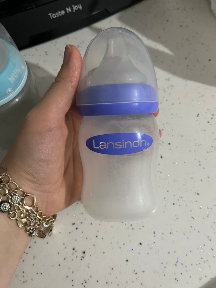 Açık mavi Lansinon bebek biberonu, şeffaf kapak ve yumuşak emzik ile kolay besleme sağlar. Bebekler için uygundur.