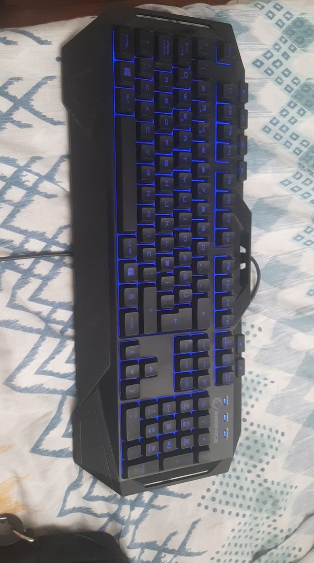 Canlı mavi LED aydınlatmalı koyu mavi klavye, tam tuş takımı ve sayısal tuşlar içerir. Kablolu ve modern köşeli tasarıma sahiptir. ⌨️