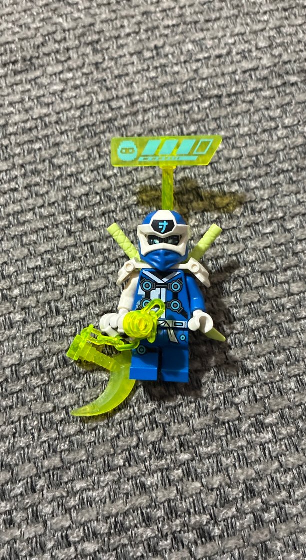 Neon sarı silahlar ve zırh detaylarına sahip mavi LEGO ninja figürü. Miğfer ve sırtında iki kılıç bulunur.