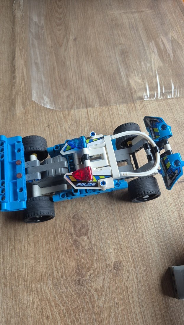 Renkli mavi Lego polis arabası, detaylı tekerlekler ve üstünde polis lambası ile işlevsel tasarıma sahiptir.