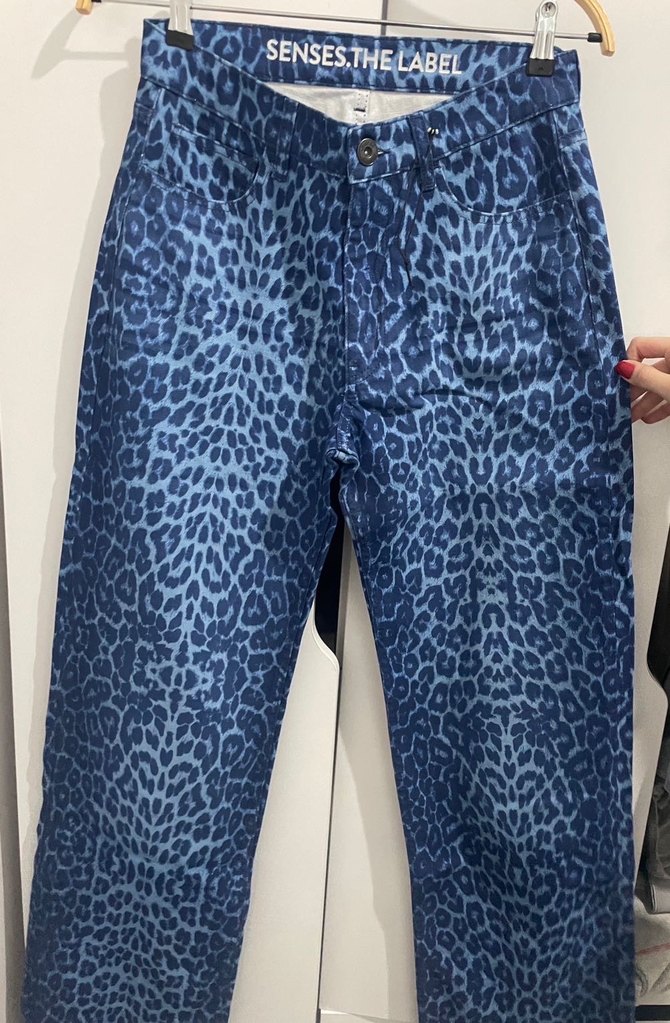 Mavi lacivert renkte leopar desenli, turuncu jakronlu straight kesim mavi denim pantolon. 28 beden fakat ben 27 bedenim rahatlıkla giyiyordum 36-38 bedene takabul eder Defo yok Sadece bir kez kullanıldı