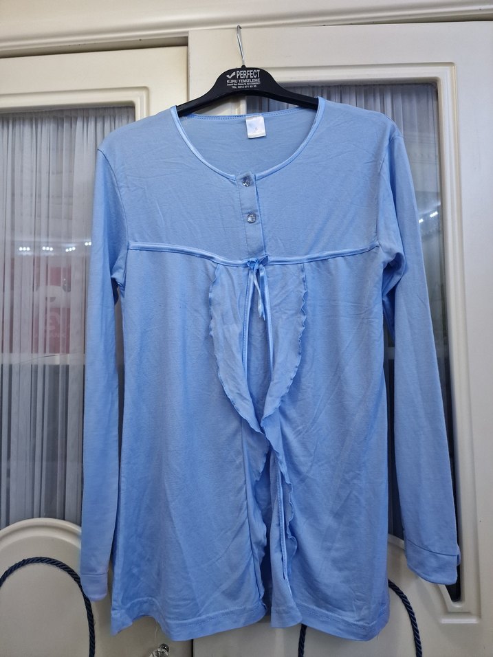 Pastel mavi renkte, uzun kollu, yuvarlak yakalı, bol kesim ve midi boy lohusa ve emzirme geceliği. Önü düğmeli ve bağcıklı, emzirme kolaylığı sağlar.