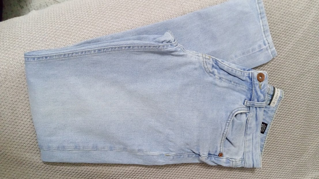 Pastel mavi renkte, düğmeli ve normal midi boyda, rahat kesimli erkek kot pantolon, günlük kullanıma uygundur. ceplerinde az soyulma