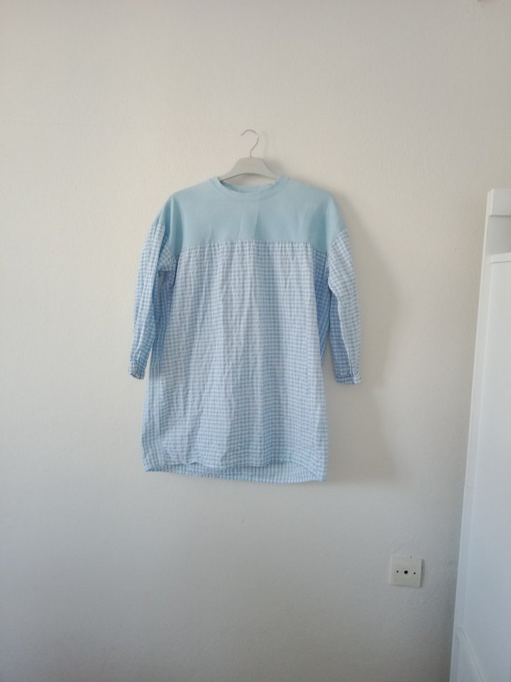Pastel mavi renkte, uzun kollu, yuvarlak yakalı, düğmeli ve rahat kesim hamile gömleği. Yumuşak keten kumaştan üretilmiş, gündelik kullanım için sade tasarım.