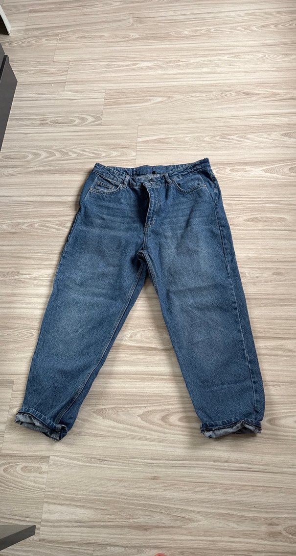 Mavi denim kumaştan, loose fit ve normal midi boyda, desen içermeyen kadın kot pantolon. Günlük kullanıma uygun, rahat ve şık görünümlü.