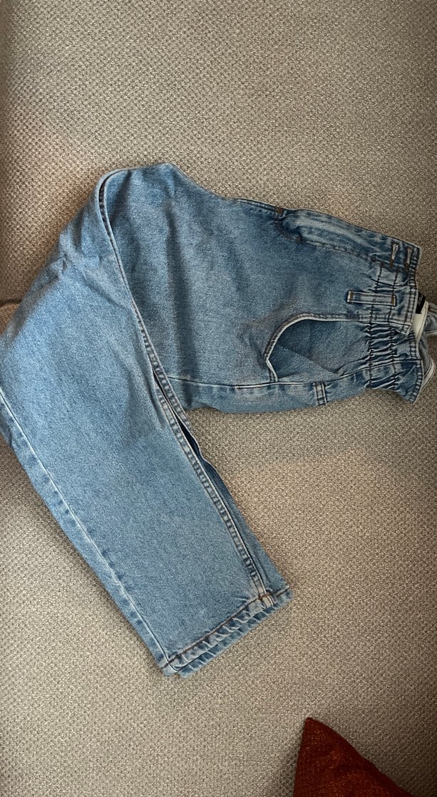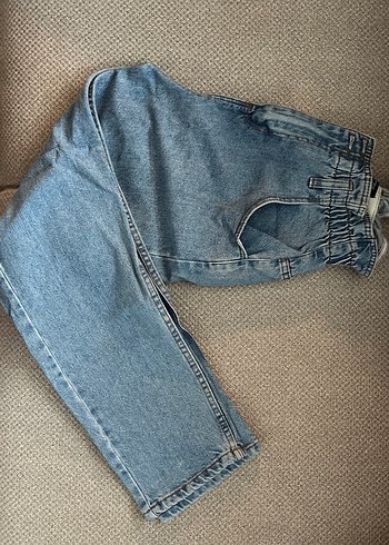 Mavi kot kumaştan, tokalı bel ve normal boyda, rahat kesim midi pantolon. Gri tonlarında yumuşak dokulu kumaş. Duruşunu en sona ekledim