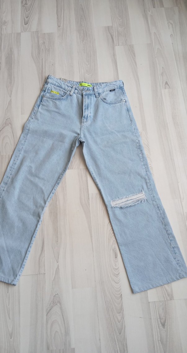 Pastel mavi renkte, yırtık detaylı, bol kesim midi uzunluğunda kot pantolon. Sokak stiline uygun, günlük kullanıma elverişli.