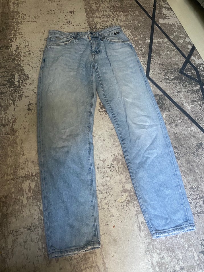 Mavi ve gri tonlarda, midi boy ve loose fit kesime sahip kot pantolon. Günlük kullanım için rahat, desen içermeyen, trend sokak stili için uygun