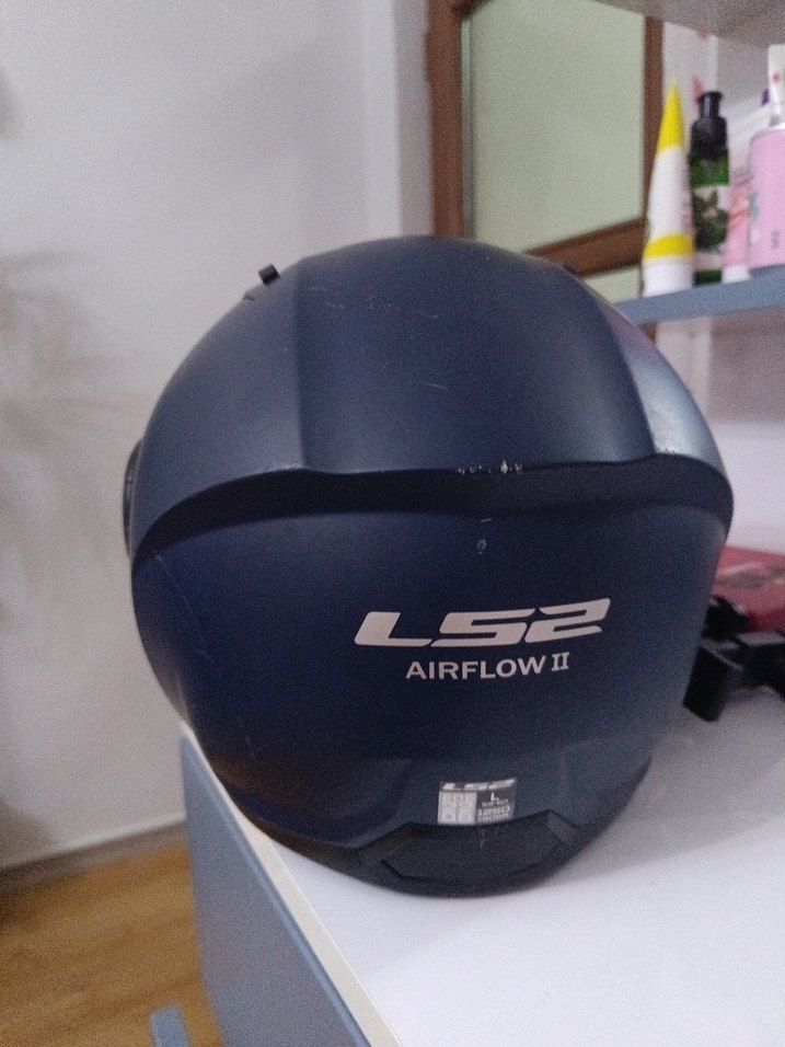 Koyu mavi LS2 biker kask, baskılı desen ve hava akışı sağlayan AIRFLOW II özelliğine sahiptir. Plastik malzemeden üretilmiş, Velcro kayışlı ve sade tasarımlıdır. ️ Ufak tefek çizikleri vardır fakat büyük bı kusur yoktur. gayet sağlam durumdadır.