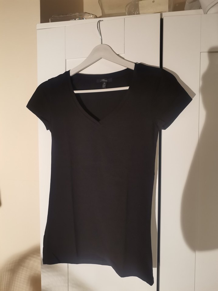 Siyah, V yakalı ve kısa kollu, vücuda oturan kadın tshirt. Mavi markasının düz, siyah basic tshirtü.