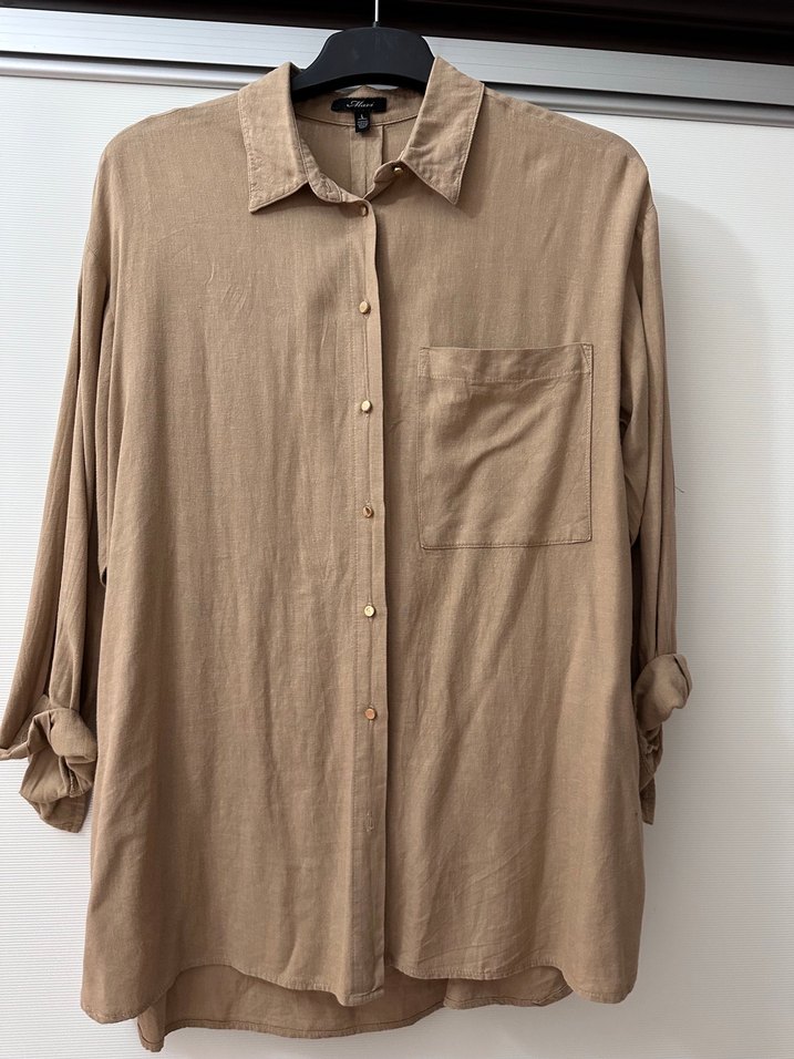 Bej keten, düğmeli, yakalı ve uzun kollu gömlek. Rahat kesimi ve keten dokusuyla günlük kullanıma uygundur. Çok rahat ve Herşeyin üzerine uygun