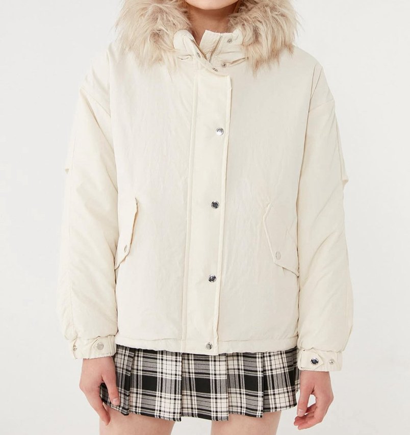 Beyaz, yakalı ve uzun kollu bu ceket, gevşek kesimi ve kapüşonundaki kürk detaylarıyla dikkat çeker. Yumuşak sentetik kumaştan yapılmıştır, günlük kullanıma uygundur. 158 boy 65 kilo ile giydim fazlalıktan satılıktır