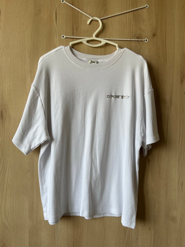 Beyaz oversize kesim tişört, kısa kollu ve yuvarlak yakalı. Minimalist baskılı tasarıma sahip, günlük kullanıma uygun.