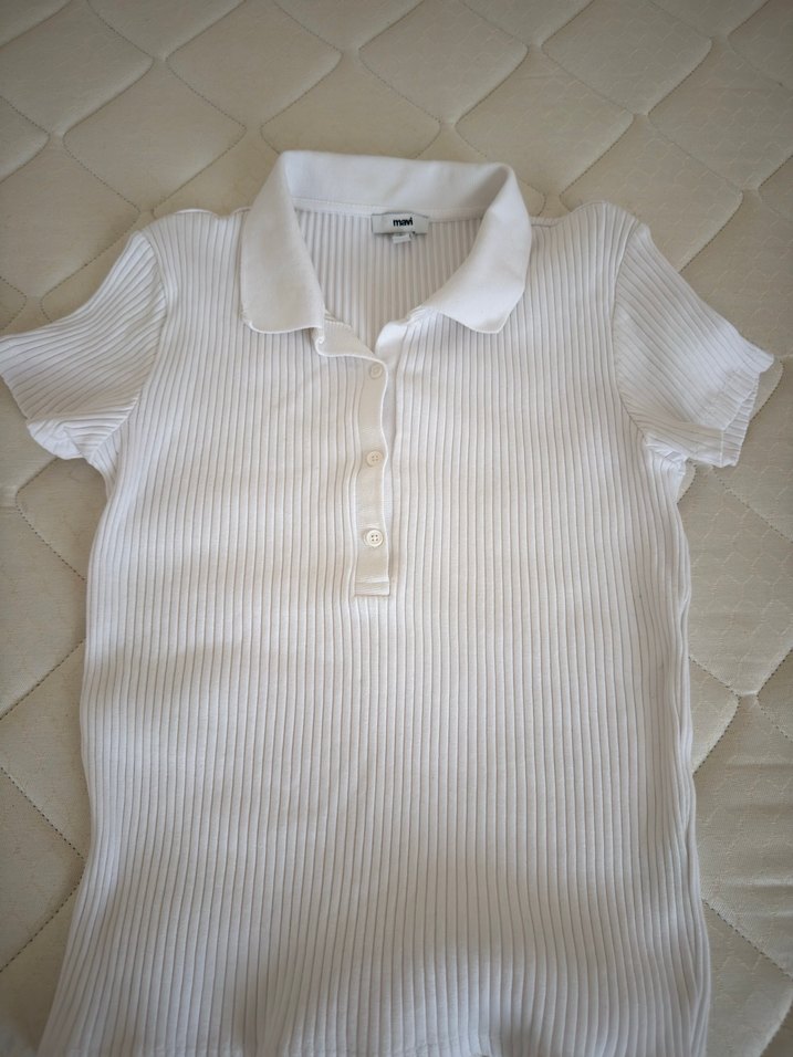 Pamuklu, düğmeli ve yakalı beyaz kız polo tişörtü, kısa kollu ve vücuda oturan kesime sahiptir. Pastel tonlarda, desen içermeyen, günlük sokak stili için uygundur.