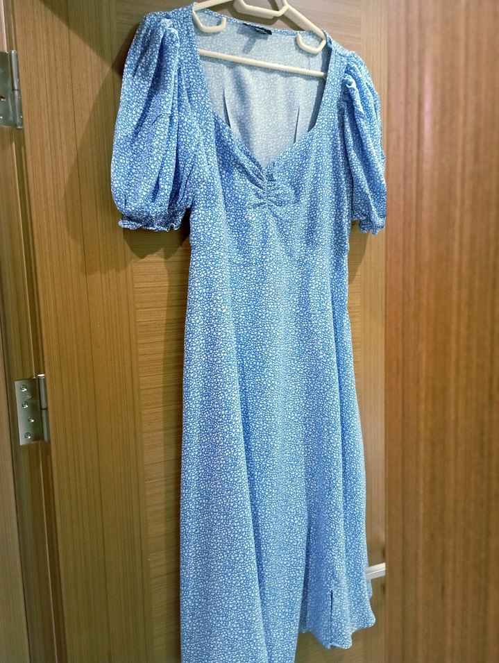 Mavi uzun elbise, V yaka ve kısa balon kollara sahip. Yumuşak sentetik kumaştan, bol kesim ve drapeli tasarım. Pastel batik deseni bohem tarz sunar.