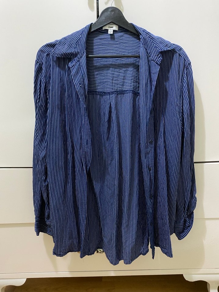 S beden Loose fit örme kumaştan, lacivert renkte uzun kollu bol kesim gömlek. Çok rahat bir kumaşı vardır dökümlüdür. Konferans için almıştım. Yalnızca bir kez kullandım. Hiçbir deformasyonu yoktur yeni gibi