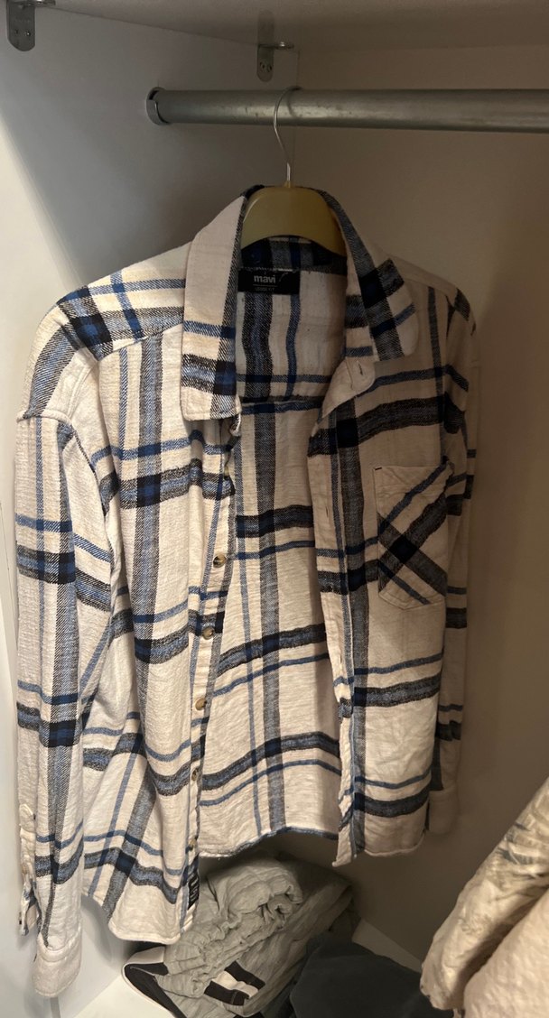 Gri beyaz ekose desenli, düğmeli, keten kumaştan, uzun kollu ve normal boyda salaş kesim erkek gömlek. Günlük kullanıma uygundur.
