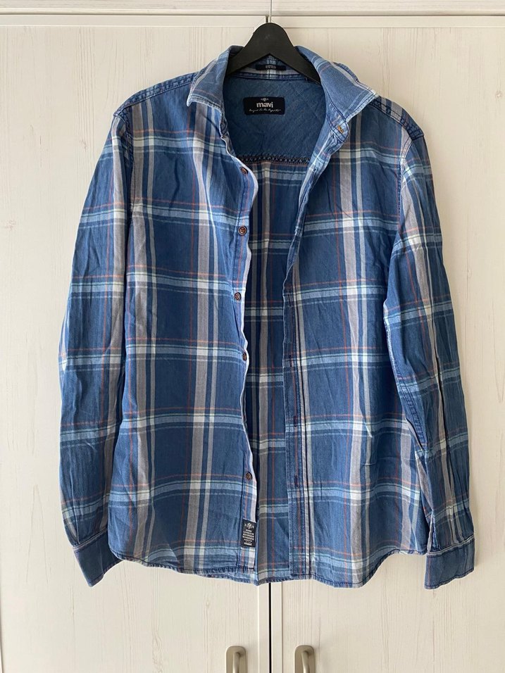Mavi renkli, düğmeli, yakalı, uzun kollu, rahat kesim erkek denim gömlek. Sokak modasına uygun ekose desenli, günlük kullanım için ideal.