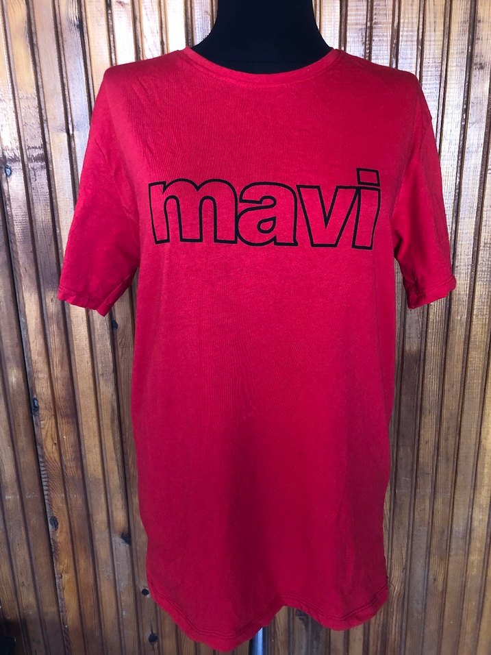 mavi marka kırmızı renkli kısa kollu bisiklet yaka önünde mavi yazı baskılı pamuklu likralı L bedene uygun erkek tişört koltukaltı ölçüsü 46 cm boy 68 cm