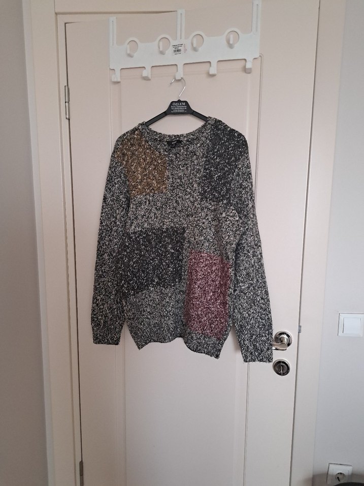 Gri renkli, desenli örgü kadın kazak uzun kollu ve yuvarlak yakalıdır. Rahat kesimiyle günlük kullanıma uygundur.
