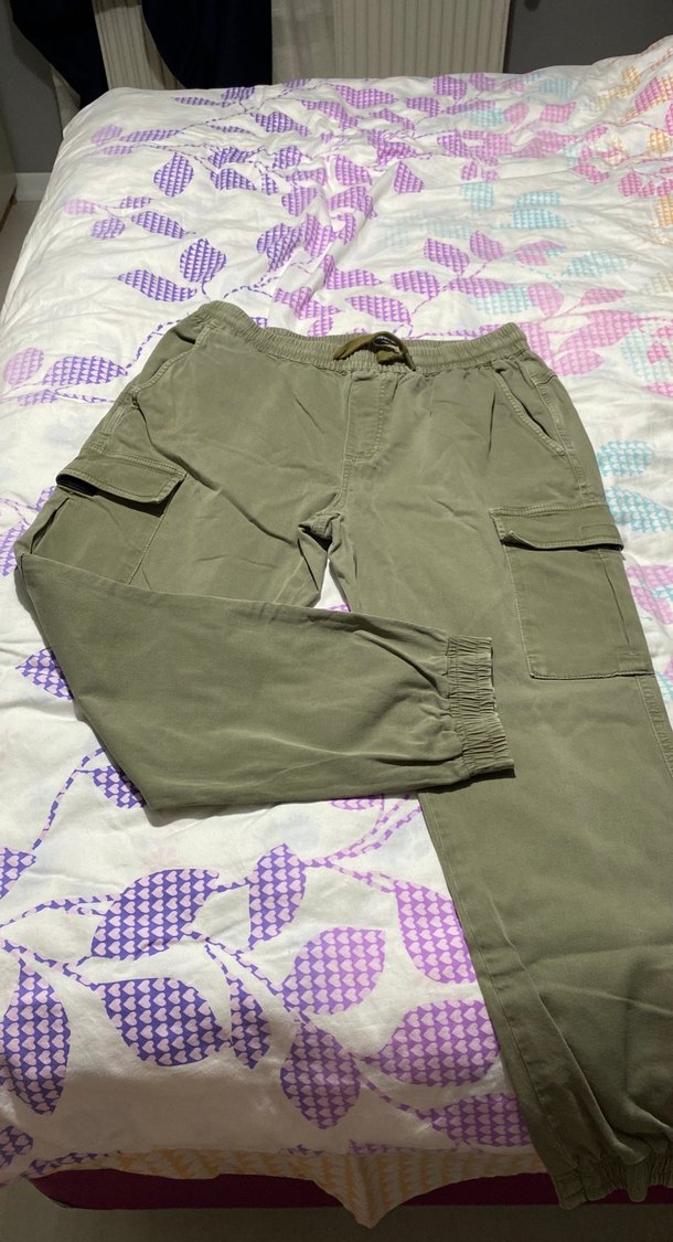 Mavi markaya ait, haki yeşil renkte kargo jogger pantolon.Bel ve paçaları lastiklidir, rahat kalıptır. Diz izi yıpranma yok temiz kullanılmıştır