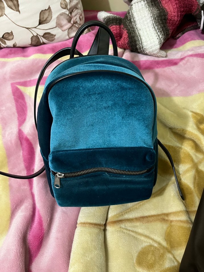 Kadife dokulu, tokalı ve renkli mavi sırt çantasıdır. Önünde fermuarlı cep ve tie-dye desen bulunur. Sokak stili ve günlük kullanım için uygundur. Seneler önce doğum günümde hediye geldi ve hiç kullanılmadı dolapta duruyo çok tatlı bir çanta ama sırt çantası kullanmıyorum