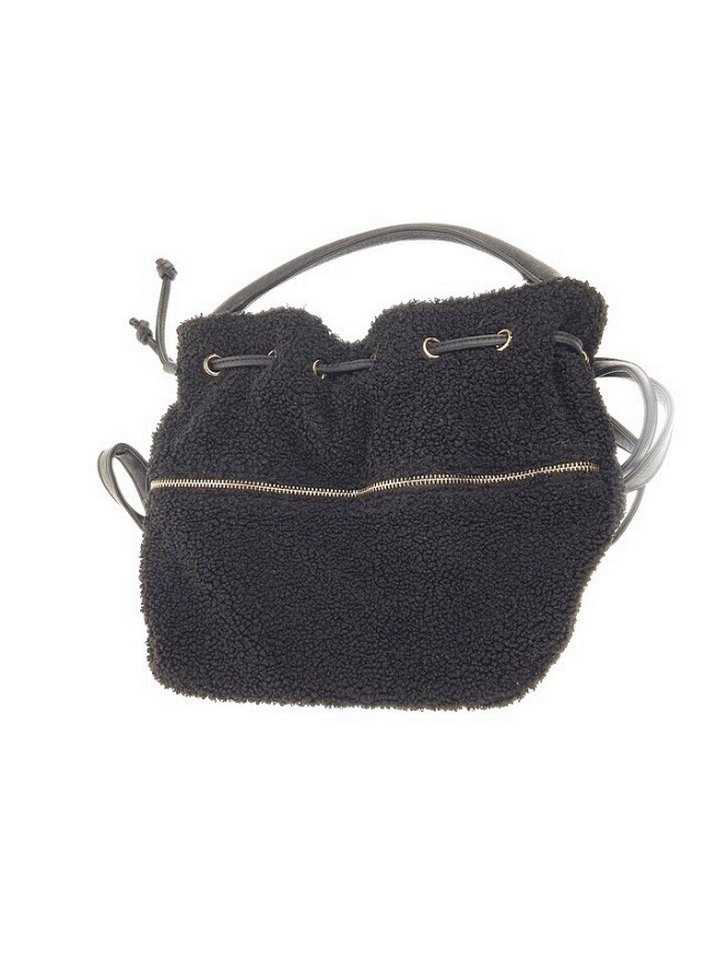Siyah peluş kumaştan kemer detaylı kadın çantası, yumuşak dokulu ve desensiz, günlük rahat sokak stili için uygundur. Yükseklik 26 cm, genişlik 30 cm.