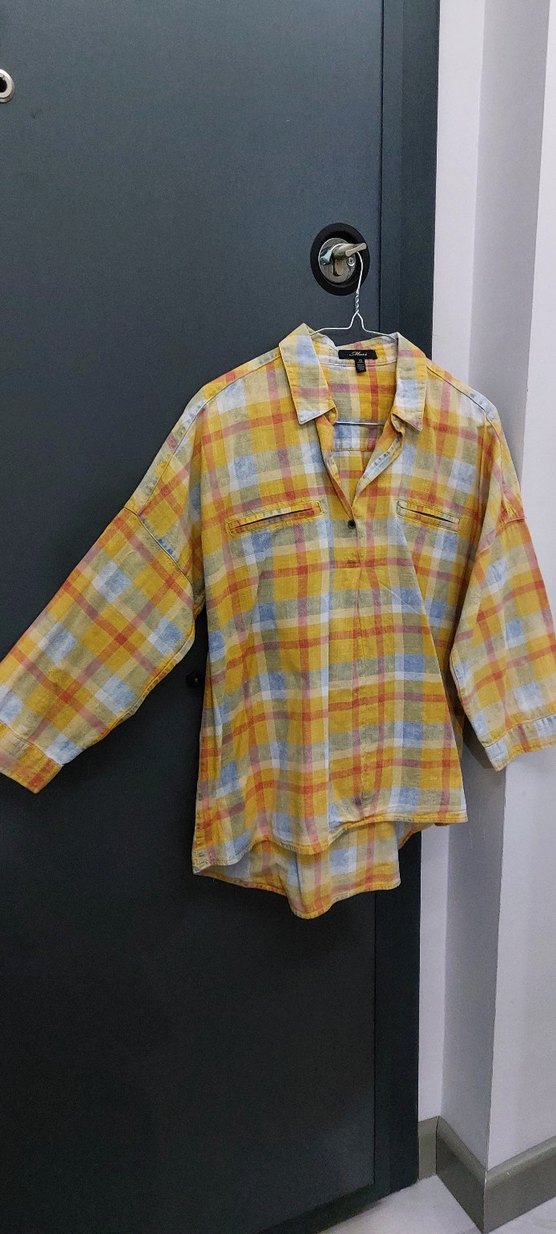 Salaş kesim, uzun kollu, yakalı gömlek. Pastel sarı tonlarında batik desenli, nefes alabilen keten kumaştan üretilmiştir. Günlük kullanıma uygun. deforme yok boy: 60 koltuk altından koltuk altına en:50