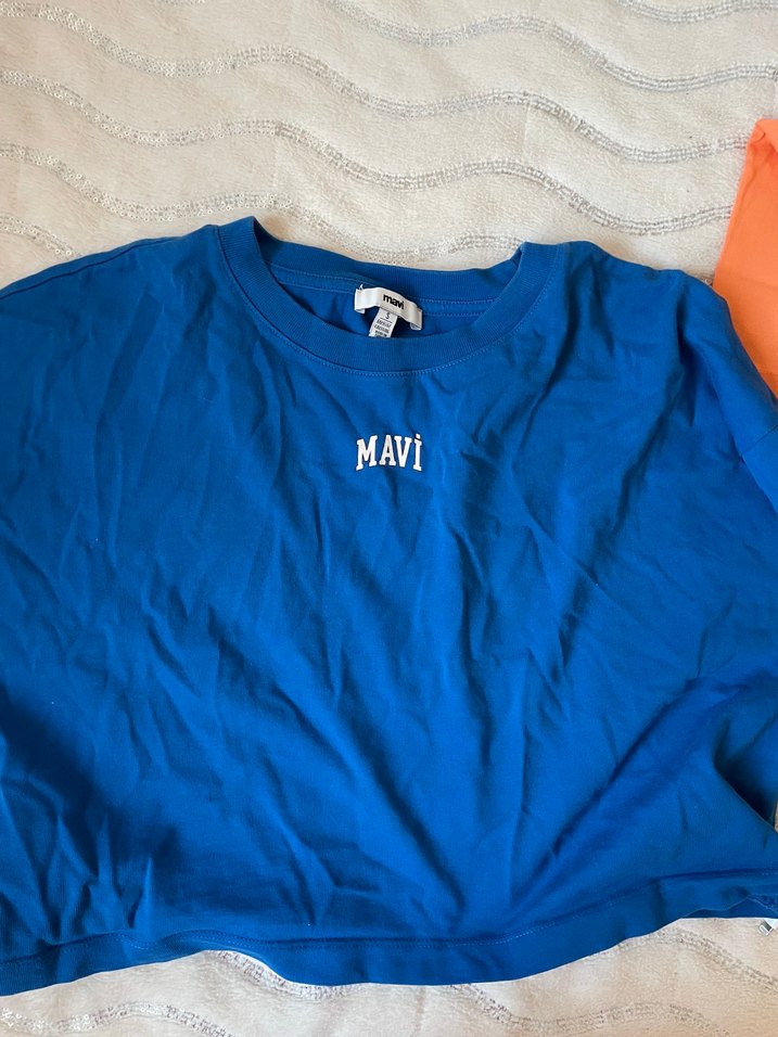 Koyu mavi renkli, kısa kollu, yuvarlak yakalı, bol ve drapeli kesime sahip kadın tişörtü. "MAVI" baskılı, normal boyda, günlük kullanıma uygun.