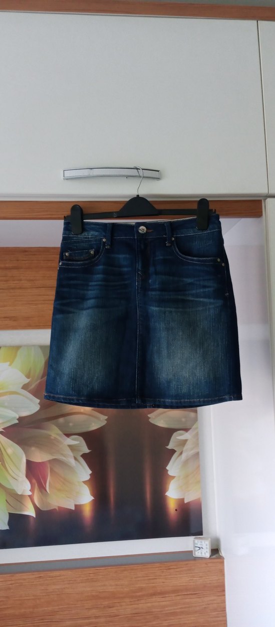 Koyu lacivert renkte, dar kesim mini etek. Günlük kullanım için uygun, desen içermeyen sade tasarım. Görüldüğü gibi sorunsuz tertemiz, yesyenidir