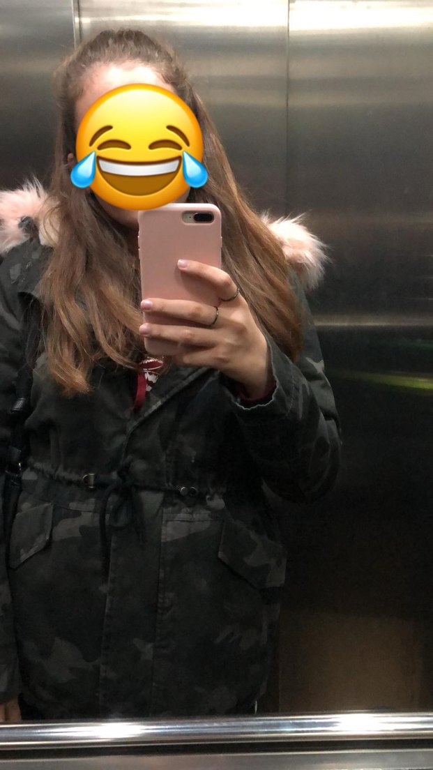 Kürk detaylı kapüşon ve kamuflaj desenli, gri renkli, normal boy, fitted kesim kadın kışlık mont. Sorunsuz.