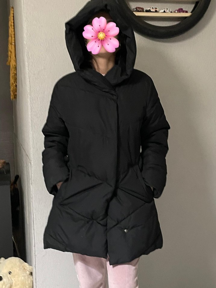 Siyah, kapüşonlu, yüksek yakalı ve uzun kollu puff mont. Normal midi boyda, yumuşak ve sıcak kumaştan, rahat günlük sokak stili için uygun.