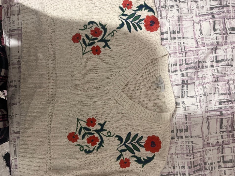 Kadınlar için nakışlı çiçek desenli, V yaka, uzun kollu, gevşek kesim beyaz örme kazak. Günlük kullanıma uygun bohem tarzda rahat bir parça.
