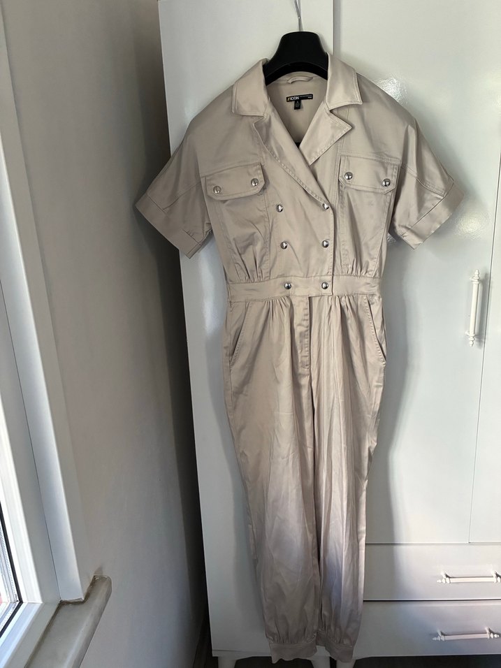 Bej midi uzunlukta, düğmeli ve kısa kollu, bol kesim kadın tulum. Düğme kapamalı, cepli ve sentetik kumaştan üretilmiştir. Günlük kullanıma uygundur.