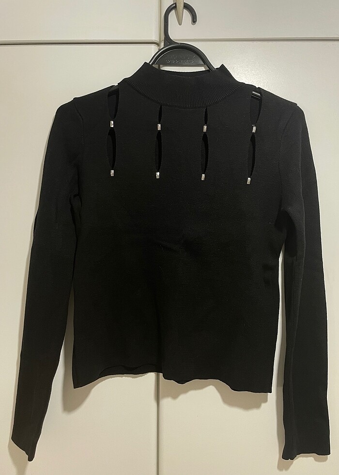 Mavi marka siyah kazak s beden ön kısmında yırtmaç detayları mevcut tok bir kumaşı var bir defa giyildi