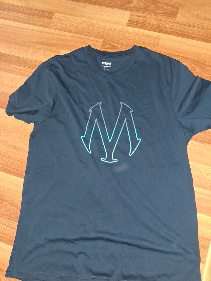Koyu mavi renkte, önünde baskılı 'M' logosu bulunan erkek kısa kollu tişört. Denim kumaştan, yuvarlak yakalı ve bol kesimli, sportif ve rahat bir stil sunar.